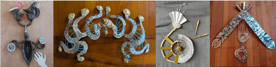 Je concois ces bijoux en laiton à la main. Je les percois comme un ensemble de petits acrobates synchronisés, figures aériennes, ou aquatiques. Il existe de multiples variations possibles. Ils peuvent se porter de différentes manières et aussi être des objets de décoration. J'aimerais aussi réaliser des objets utilitaires. Les tarifs seront bientôt visibles. Pour tout renseignements, veuillez me contacter dans la rubrique Contact.